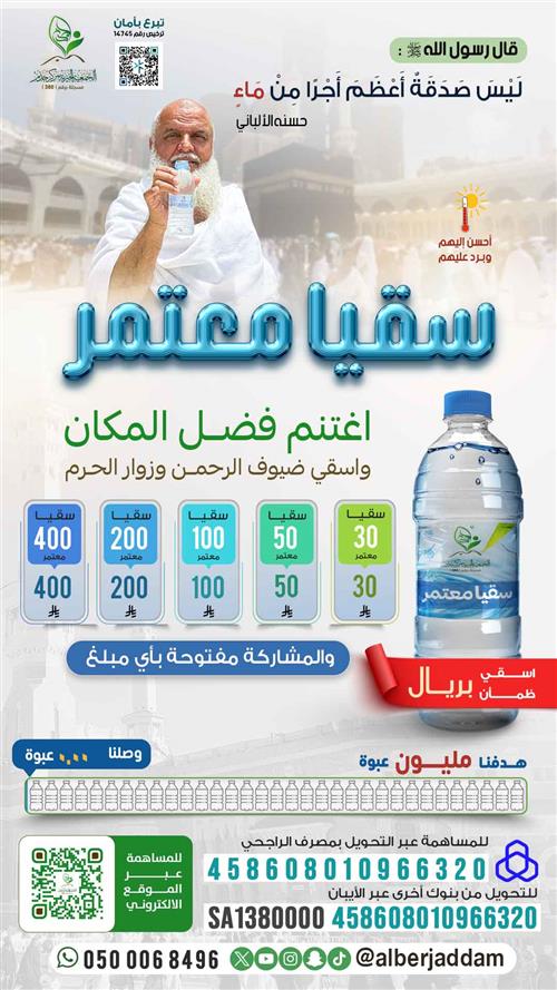 ساهم بتبرعك واروِ عطشهم لتنال الأجر قال ﷺ "في كل كبد رطبة أجر" كل قطرة ماء تُسقى لضيوف الرحمن بجوار بيت الله الحرام تمثل بركة عظيمة وثواباً لا ينقطع.